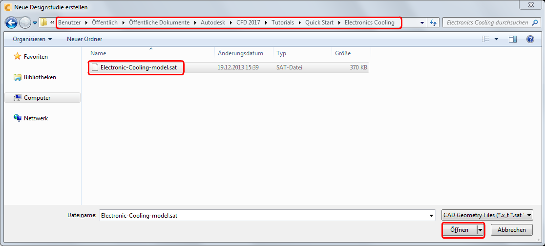 3. Navigieren Sie zu C:\Benutzer\Öffentlich\Öffentliche Dokumente\Autodesk\CFD 2018\Lernprogramme\Quick Start\Electronics Cooling und wählen Sie Electronic-Cooling-model.sat aus. Klicken Sie auf Öffnen.