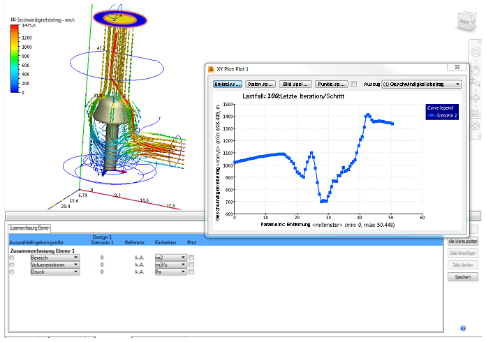 Flusssteuerungssimulationen zeigen in der Regel, wie das Fluid durch das Gerät strömt, sowie entweder den Druckverlust oder die Durchflussrate.