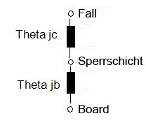 Das typische kompakte thermische Modell mit zwei Widerständen besteht aus lediglich drei Knoten: der Trennebene, dem Gehäuse und der Leiterplatte. Die Trennebene wird auch als Form oder Chip bezeichnet. Das Gehäuse ist die Oberseite des Pakets. Auf ihm kann ein Kühlkörper montiert werden. Der Leiterplattenknoten ist eine einzelne Kontaktstelle zwischen der Leiterplatte und dem Paket. Die Knoten sind durch einen thermischen Widerstand zwischen dem Gehäuse und der Trennebene (Theta JC) und einen Widerstand zwischen der Trennebene und der Leiterplatte (Theta JB) verbunden. Im Folgenden ist das Widerstandsnetzwerk abgebildet: