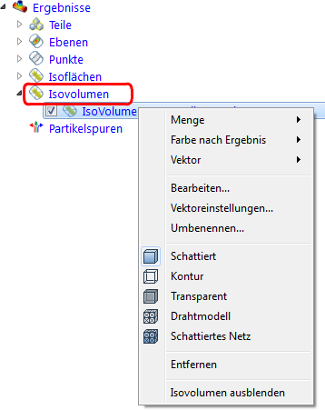 Das Kontextmenü bietet einen umfassenden Satz von Steuerelementen für Isovolumen: