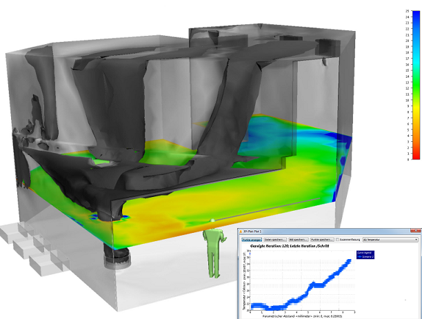 Die Ausgabegröße Sichtbarkeit im Rauch gibt an, in welchem Abstand ein Zeichen von jedem Punkt im Modell aus sichtbar ist. Der Sichtbarkeitsabstand in der Nähe der Brandquelle ist normalerweise aufgrund starker Rauchentwicklung sehr gering. Er fällt in Entfernung von der Brandquelle aufgrund einer geringeren Rauchkonzentration und besserer Sichtbarkeit in der Regel deutlich höher aus.