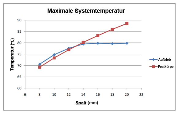 Um die Genauigkeit dieser Herangehensweise zu ermitteln, wurde eine Studie durchgeführt, in der der Abstand im Bereich zwischen 8 und 20 mm verändert und anschließend unter Einsatz beider Methoden berechnet wurde. Unterhalb des kritischen Abstandes ist die Übereinstimmung zwischen Auftriebskraft und "Fester Luft" relativ gut. Oberhalb des kritischen Abstandes nimmt die Übereinstimmung aufgrund der größeren Rolle von Konvektion als Wärmeübertragungsweg, wie erwartet, ab.