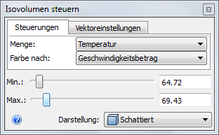 Die Menge ist das skalare Ergebnis, das die Form des Isovolumens bestimmt. Die Menge unter Farbe nach Ergebnis bestimmt die Farbe des Volumens. Vorgabemäßig sind sie identisch. Wählen Sie andere skalare Ergebnisse aus, um zwei Ergebnisse zusammen anzuzeigen. Ein Beispiel wäre, die Temperatur als Menge und den Geschwindigkeitsbetrag als Farbe nach Ergebnis festzulegen. Dies zeigt die Temperatur an allen Positionen im Modell an, die sich innerhalb des angegebenen Bereichs des Geschwindigkeitsbetrags befinden.