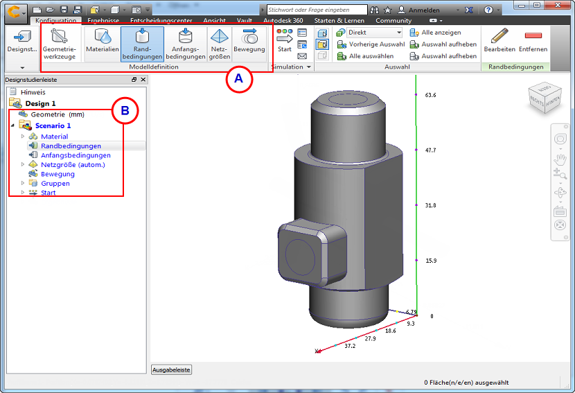 Aktivieren Sie zunächst die Aufgabe Randbedingung, entweder über Konfiguration (Registerkarte) > Konfigurationstasks(Gruppe) (A) oder aus der Designstudienleiste (B):