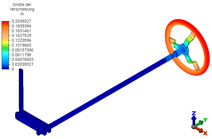 Nach der Volumenvernetzung erfolgt die Analyse, und das Modell wird in der Ergebnisanzeige angezeigt. Anfangs wird vorgabemäßig die Größe der Verschiebung dargestellt. Die maximale Verschiebung beträgt ca. 0.2 Zoll.