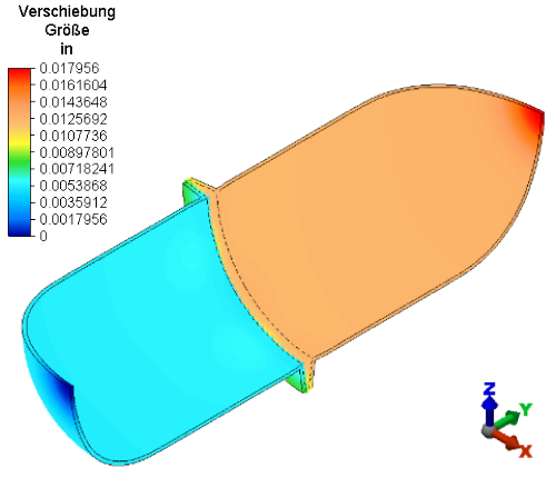 Die verschobene Form des Modells wird überhöht dargestellt, d. h., der Druckbehälter wird nicht so weit verschoben wie hier angezeigt. Die maximale Verschiebung beträgt ca. 0.018 Zoll.