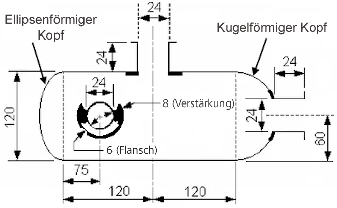 - Ein Ende des Zylinders trägt einen ellipsenförmigen Kopf mit dem Ellipsenverhältnis 2.