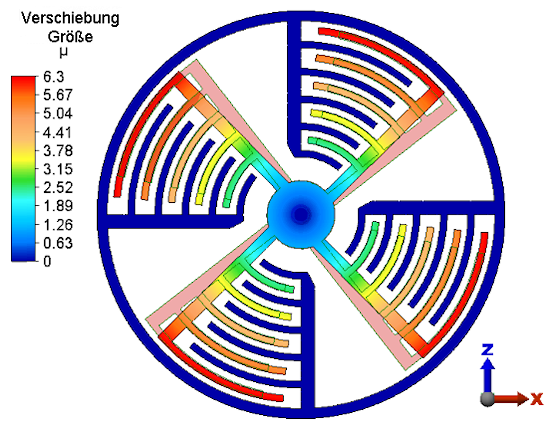 Simulation ausführen. Die Analyse erfolgt. Das Modell wird unter Ergebnissen angezeigt. Vorgabemäßig wird anfangs die Verschiebungsgröße angezeigt. Als Nächstes zeigen Sie die tatsächliche verformte Form (absolute Skalierung = 1) an und legen die unverschobene Form transparent über die Ergebnisse der Verschiebung.