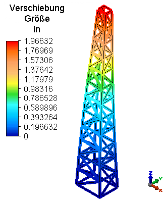 Resultierend. Die angezeigte Größe der Verschiebung ist die Resultante der Verschiebung in den fünf natürlichen Schwingungsmodi. Die maximale Verschiebungsgröße beträgt ungefähr 1.97 Zoll, wie in der folgenden Abbildung gezeigt.