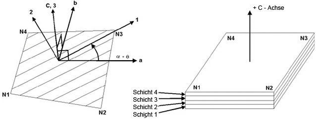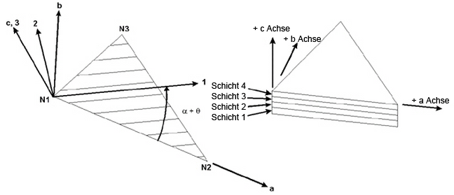 Die Layerachse 1 ist die Achse entlang der Faser jedes einzelnen Layers. Die Layerachse 2 ist lotrecht zur Faser jedes einzelnen Layers in der Elementebene angeordnet. Die Layer-Achse 3 ist lotrecht zum Element und daher parallel zur lokalen Elementachse C angeordnet.