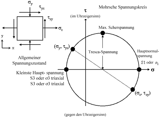 Mohrs Kreis ist eine grafische Methode zur Visualisierung des Belastungszustands an einem Punkt für verschiedene Richtungen (Ebenen). Die Hauptbelastung tritt auf einer Ebene auf, bei der die Scherbelastung gleich Null ist. Die maximale Scherbelastung (oder Tresca-Belastung) entspricht dem Radius des Kreises (= 0,5 * (maximale Hauptbelastung - Mindest-Hauptbelastung)). Der Bereich der Belastungsintensität wird häufig bei der Entwicklung von Druckbehältern verwendet und ist definiert als (maximale Hauptbelastung - Mindest-Hauptbelastung). Da es sich um den Durchmesser des Mohr-Kreises handelt, entspricht der Bereich der Belastungsintensität der Belastung Tresca * 2, die in der Ergebnisanzeige geplottet wird.
