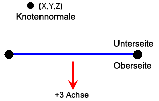 X, Y und Z: Ein Punkt im Raum wird verwendet, um die Ausrichtung der Normalenachse des Elements (lokale 3 Achse) zu steuern, oder um zu steuern, welche Seite des Elements die obere Seite (+3 Seite) und die Unterseite (-3 Seite) ist. Die Richtung der Normalen wird durch Festlegen eines Punkts im Raum anhand der X-, Y- undZ-Spalten unter der Überschrift Knotennormal ermittelt. (Siehe Abbildung 2). Ein positiver Normaldruck wird normal auf die Schalenelemente in Richtung der +3-Achse angewendet (drückt auf die untere Seite). Ein negativer Normaldruck wirkt in die entgegengesetzte Richtung (drückt gegen die obere Seite).