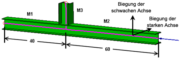 Während der Codeprüfung werden mehrere Balkenelemente kombiniert, wobei die Länge jedes Objekts in den Analysen der zulässigen Spannung verwendet wird. Die Längen für die Biegung über die schwache Achse und über die starke Achse sind separate Werte.