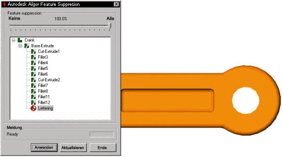 Nach dem Unterdrücken der unnötigen Details kann das Dialogfeld Autodesk Simulation - Elementunterdrückung geschlossen werden, und Sie können Simulation starten aus dem Autodesk Simulation-Pulldown-Menü auswählen, um das Bauteil ohne die unterdrückten Elemente zu übertragen.