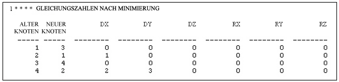 Wie korrelieren die Begriffe in der Steifigkeitsmatrix mit dem Modell und den Knoten? Dies ist aus Abbildung 3 ersichtlich. FHG, was für Freiheitsgrad steht, bezieht sich auf einen bestimmten Knoten und eine bestimmte Bewegung: entweder eine Translation oder Drehung. Diese Korrelation kann durch Drucken der Gleichungszahlen mit der Option Global: Ausgabe: Gleichungszahlendaten ermittelt werden. Abbildung 4 zeigt ein Beispiel für einen Ausdruck der Gleichungszahlen, die in der Zusammenfassungsdatei (.ml) dargestellt werden. In einigen Fällen ist es möglicherweise einfacher, die Bandbreitenminimierung (Global: Optionen: Bandbreitenminimierung vermeiden) zu vermeiden.