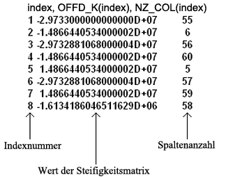 Die ersten und zweiten Abchnitte müssen verwendet werden, um den Rest der Steifigkeitsmatrix zu erstellen. Die vierte Spalte des ersten Abschnitts definiert, wie viele Werte ungleich Null sich in dieser Zeile befinden. Bezugnehmend auf Abbildung 5 enthält die erste Zeile nur 1 nicht-diagonalen Wert ungleich Null und die zweite Zeile drei nicht-diagonale Werte ungleich Null. Daher befindet sich in Abbildung 6 der Wert für Index 1 in der ersten Zeile und die Werte für die Indizes 2, 3 und 4 in der zweiten Zeile. Diese Methode kann erweitert werden, um die Zeile für jeden Ausdruck zu ermitteln. Nur die Ausdrücke ungleich Null werden in der zweiten Spalte angezeigt. Der Wert in der dritten Spalte definiert, in welcher Spalte der Matrix sich der Ausdruck befindet. Bezugnehmend auf Abbildung 6 befindet sich der erste Wert in Spalte 55. Die Werte in der ersten Zeile der Spalten 2-54 betragen deshalb alle 0. Ebenso betragen alle Werte in Zeile 2 in den Spalten 56-60 Null. (Der Wert in Spalte 1 befindet sich auf der Diagonalen und wird daher im ersten Abschnitt definiert). In der zweiten Zeile sind 0-Werte in den Spalten 3-5, 7-55 und 57-59 enthalten. Die Steifigkeitsmatrix ist symmetrisch, daher sind nur die Werte oben rechts von der Diagonalen definiert. Verwenden Sie die Symmetrie zum Definieren der unteren linken Hälfte.