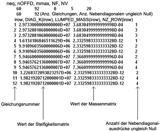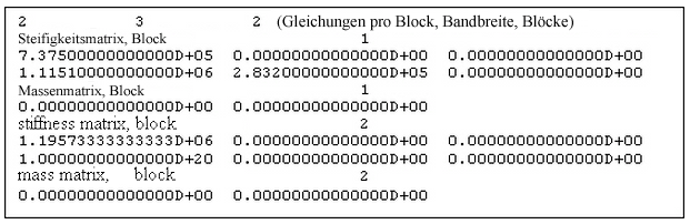Deshalb defineirt der erste Abschnitt die Diagonale der Steifigkeit und Massenmatrizen. Da die Massenmatrix keine Werte ungleich Null entfernt von der Diagonalen aufweist, ist die Massenmatrix vollständig definiert. Der zweite Abschnitt besteht aus drei Spalten, wie in Abbildung 6 dargestellt.