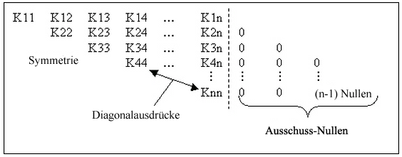 Um die Einträge in der Steifigkeitsmatrix zu verstehen, sehen Sie sich Abbildung 2 an. Die Steifigkeitsmatrix ist quadratisch und symmetrisch. Die erste Zahl in jeder Zeile der Matrix (wobei Sie beachten müssen, dass für jede Zeile möglicherweise mehrere Ausgabelinien erforderlich sind) liegt der Steifigkeitsausdruck auf der Diagonalen. Die Ausdrücke danach gelten für die obere Hälfte der Steifigkeitsmatrix. Jede Zeile in der Ausgabe enthält jedoch die Bandbreite der Anzahl Ausdrücke. Deshalb wird jeder nachfolgenden Ausgabezeile eine Null (0) hinzugefügt.