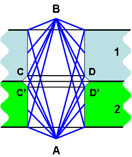 | Bauteil 1 (hellblauer Körper) und 2 (grüner Körper) weisen Flächenkontakt auf. Zwei Knotensätze sind entlang der Linie C-D vorhanden. Die Elemente des Bolzengelenks (blaue Linien) sind in der Regel nur mit einem Knotensatz entlang der Linie C-D und nicht mit beiden Knotensätzen verbunden. Somit kann sich das Gelenk normalerweise frei bewegen. Wenn sich das Gelenk aus irgendeinem Grund so verhält, als ob es blockiert ist, verwenden Sie die auf der rechten Seite gezeigte veränderte Geometrie, um das Problem zu beheben. |