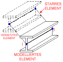 Wenden Sie einen Versatz auf Balkenelemente an, wenn die Linien, aus denen sich die Balken zusammensetzen, nicht dort gezeichnet werden können, wo sich die neutrale Achse tatsächlich befindet. Versetzen Sie den Balken um den entsprechenden Abstand und in die entsprechende Richtung, damit die Balkeneigenschaften an der richtigen Position der neutralen Achse dargestellt werden. Die folgende Abbildung zeigt, wie der Gleichungslöser die Balkenelemente mit dem angewendeten Balkenversatz sieht.