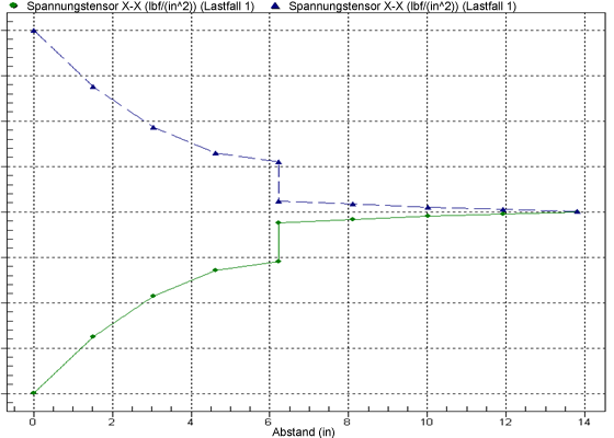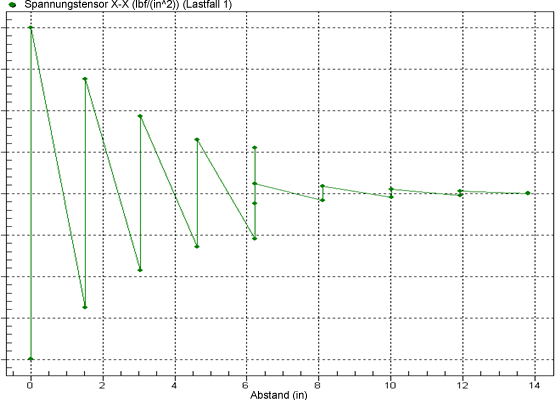 (b) Da Schalenelemente verschiedene Spannungen auf der Ober- und Unterseite haben, führt das Erstellen eines Plots der X-X-Spannungstensoren mit den Vorgabeeinstellungen zu einem gestreuten Plot. Wenn die Plotmethode Punkte + Linien verwendet wird, ist zu sehen, dass die Daten nicht wie erwartet verbunden werden.