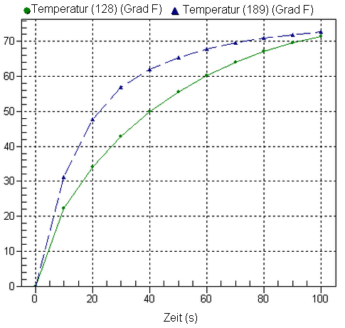 Die Temperatur an zwei Knoten aus einer transienten Wärmeübertragungsanalyse wird im Graphen dargestellt.