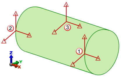Beispiel: Ein Bolzen wird in Kontakt mit einer Gabel gehalten. (Aus Gründen der Übersichtlichkeit wird die Gabel nicht angezeigt.) Die Federn bei 1 und 2 verhindern die Translation des Bolzens in X, Y und Z und die Drehung um Y und Z, aber nicht, dass der Bolzen sich um die X-Achse dreht (technisch gesehen die Linie, die bei 1 und 2 auf die Knoten trifft). Die Federn bei 3 verhindern, dass der Bolzen sich darum dreht. (Technisch gesehen sind die die Federn in der X- und Y-Richtung an Punkt 3 nicht erforderlich, können aber aus praktischen Gründen hinzugefügt werden.)