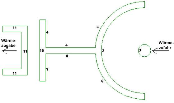 Abbildung 3 Es existieren vier unabhängige Gruppen von Flächen, die gegenseitig strahlen. Deshalb würden vier Gehäuse definiert werden. Gehäuse 1: Flächen 2 und 3; Gehäuse 2: Fläche 4; Gehäuse 3: Flächen 6, 8 und 9; und Gehäuse 4: Flächen 10 und 11
