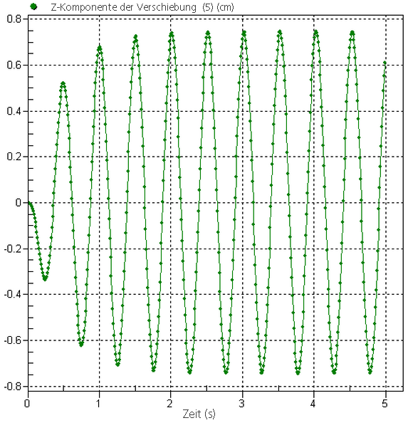 Knoten, und klicken Sie oben im Modell auf den Knoten). Klicken Sie mit der rechten Maustaste, und wählen Sie Graphenwert(e). Es wird ein zweites Präsentationsfenster mit einem Graphen erstellt. Das Ergebnis sollte dem in Abbildung 2 entsprechen. Nach ungefähr fünf Zyklen wird ein fast stationärer Zustand erreicht. Nach visuellen Aspekten scheinen die Ergebnisse ca. 0.75 cm zu sein, die erwartete Verschiebung der Masse relativ zum Lager.