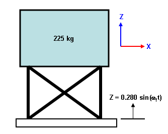 Anstatt das gesamte Tragwerk im Detail zu modellieren, kann es auch mit Stabelementen dargestellt werden. (Erinnern Sie sich, die Steifigkeit eines Stabelements k ist A*E/L.) Die Masse kann durch eine konzentrierte Masse dargestellt werden, die am Ende des Stabs hinzugefügt wird. Die sich bewegende Basis wird durch eine feste Begrenzungsbedingung dargestellt und eine Bodenbewegung oder Basis-Beschleunigungslast wird die Schwingung der Basis simulieren. Das Ende des Stabelements mit der Masse hat eine Begrenzungsbedingung, die die Schwingung der Masse auf die Axialrichtung beschränkt.