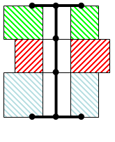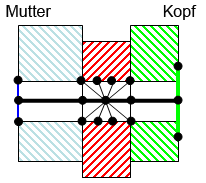 Seitenansicht der Schraube. Die Schraubenlinie ist die dicke schwarze Linie auf der Mittellinie des Lochs. Der mittlere Abschnitt ist als Gewinde definiert, sodass die Knoten auf der Lochfläche mit der Mitte des betreffenden Schraubensegments verbunden sind (dünne schwarze Linien). |