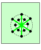Ansicht der Kopfseite. Der Kopfdurchmesser ist größer als der Schraube, sodass sechs Speichen (dicke grüne Linien) basierend auf dem Kopfdurchmesser (gestrichelter Kreis) hinzugefügt werden. Die dünnen grünen Linien verbinden die Schraubenlinie mit dem Lochumfang. |