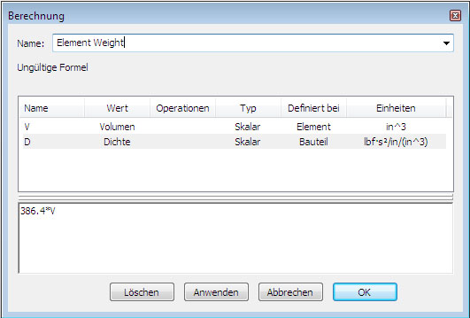 Anmerkung: In diesem Beispiel wird die Analyse Elementgewicht nicht im Pulldown-Menü ERGEBNISSE angezeigt, es sei denn, die Analyse für Gewicht und Schwerpunkt wird zuerst ausgeführt (Analyse Analyse Gewicht und Schwerkraft). Dieses Problem tritt auf, da die Formel den Wert für Volumen enthält, der mit dem Befehl Gewicht und Schwerkraft berechnet wird.