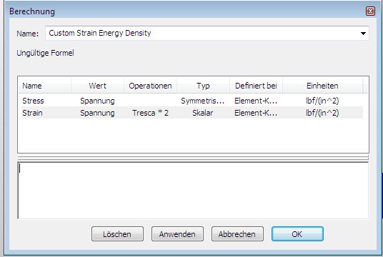 In diesem Beispiel wird die Analyse der Dehnungsenergiedichte in der Ergebnisanzeige überprüft. Dies wird als die Hälfte der Summe der Produkte der einzelnen Spannungs- und Dehnungstensoren berechnet. Die folgende Abbildung zeigt das Einrichten des benutzerdefinierten Ergebnisses. Das benutzerdefinierte Ergebnis Dehnungsenergiedichte wurde erstellt. Die Variable Spannung wurde erstellt und dem Spannungsergebnis über das Pulldown-Menü Ergebnisse für Analyseart zugewiesen. Die Variable Dehnung wurde erstellt und dem Dehnungsergebnis über das Pulldown-Menü Ergebnisse für Analyseart zugewiesen. Die Funktion UOpTensorXX(x) wurde verwendet, wobei XX die Komponente des Spannungs- und Dehnungstensors und X entweder die Spannungs- oder Dehnungstensor-Variable ist. Die mit dieser Gleichung berechneten Werte entsprechen der Dehnungsenergiedichte.