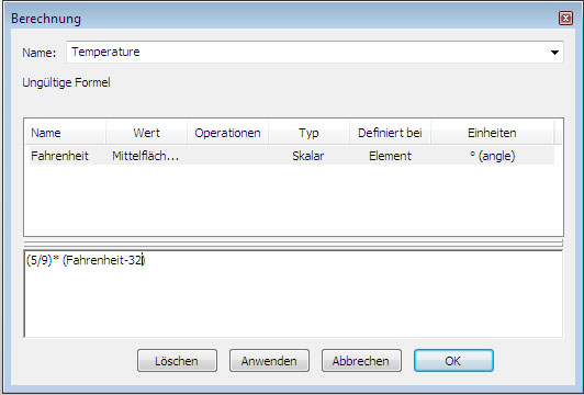 Eine andere mögliche Anwendung der benutzerdefinierten Ergebnisse besteht darin, Ergebnisse in ein anderes Einheitensystem umzurechnen. Die folgende Abbildung zeigt das Einrichten eines benutzerdefinierten Ergebnisses, das einen Temperaturverlauf in Grad Celsius für ein Modell angibt, das in Grad Fahrenheit analysiert wurde. Das benutzerdefinierte Ergebnis Temperatur Celsius und eine Variable namens Fahrenheit wurden erstellt und dem Temperaturergebnis über das Kontextmenü Ergebnisse für aktives Fenster zugewiesen. Eine Formel wurde erstellt, die den berechneten Wert in Celsius umrechnet.