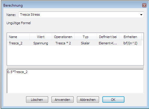 Der Befehl Ergebnisse Spannung Tresca*2 erstellt eine Kontur mit doppelter Tresca-Spannung. Um einen Plot der tatsächlichen Tresca-Spannungswerte anzuzeigen, können Sie das vorhandene Tresca*-Ergebnis mit 0,5 multiplizieren. Dies wird in der folgenden Abbildung gezeigt. Das benutzerdefinierte Ergebnis Tresca-Spannung und eine Variable namens Tresca_2 wurden erstellt und dem Tresca*2-Ergebnis über das Kontextmenü Ergebnisse für aktives Fenster zugewiesen. Eine Formel wurde erstellt, die den berechneten Wert mit 0,5 multipliziert.