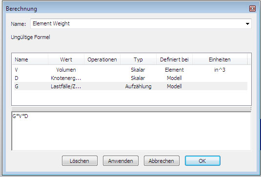 Das Gewicht jedes Elements ist das Produkt aus Massendichte, Elementvolumen und Gravitationskonstante. Es gibt zwei Möglichkeiten zum Erstellen eines benutzerdefinierten Ergebnisses, sodass eine Kontur des Elementgewichts angezeigt wird. Die erste Möglichkeit ist in der folgenden Abbildung dargestellt. Das benutzerdefinierte Ergebnis Elementgewicht wurde erstellt. Eine Variable V wurde erstellt und dem Volumen über das Pulldown-Menü Ergebnisse für Analyseart zugewiesen. Eine Variable D wurde erstellt und der Dichte über das Pulldown-Menü Ergebnisse für Analyseart zugewiesen. Eine Formel wurde erstellt, die diese Werte mit 386,4 (Erdbeschleunigung (Zoll/s 2 )) multipliziert.