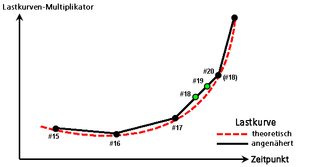 Zeitschritte Nr. 15, Nr. 16 und Nr. 17 folgen der theoretischen Kurve. Wenn Schritt Nr. 18 konvergieren könnte, befände sich die Last weiterhin auf der theoretischen Kurve (Nr. 18). Wenn jedoch der Zeitschritt reduziert wird, werden die Schritte Nr. 18 und Nr. 19 interpoliert, sodass dies zu einer leicht veränderten Last führt. In vielen Fällen ist der Unterschied zu vernachlässigen (insbesondere in Anbetracht der Annäherungen durch FEM im Allgemeinen).