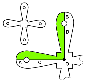 | (a) Option 1. Die Einfügung zeigt das vollständige Modell. Der farbige Bereich stellt das für die zyklische Symmetrie verwendete Modell dar. Jede Symmetrieebene besteht aus zwei Modellflächen (A und C für die eine; B und D für die andere).