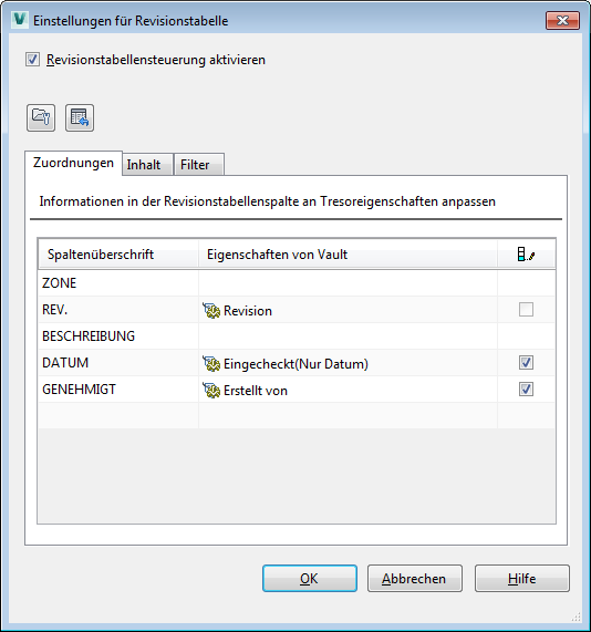Auf der Registerkarte Zuordnungen können Sie Vault-Eigenschaften den Spalten der Revisionstabelle zuordnen. ![]() |