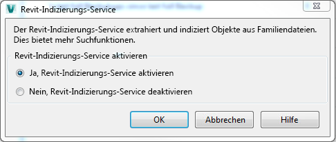 Der Revit-Indexing Service indiziert Revit-Familiendateien, einschließlich Familienparameter und Objekte, mit allen Details, sodass Sie Revit-Familiendateien mit dem Revit Vault Add-In durchsuchen können. Diese Funktion muss aktiviert werden, bevor Sie nach Revit-Familiendateien suchen können.