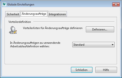 Bearbeiten von Verteilerlisten und Arbeitsablaufdefinitionen auf der Registerkarte Änderungsaufträge im Dialogfeld Globale Einstellungen.