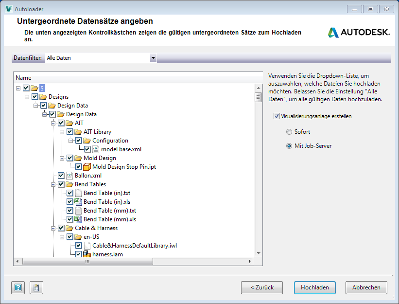 Zur Verwendung des Job-Servers in Autoloader aktivieren Sie das Kontrollkästchen Visualisierungsanhang erstellen, und wählen Sie dann im Fenster Untergeordnete Datensätze angeben das Optionsfeld Mit Job-Server.