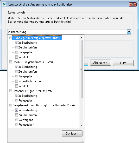 - Wählen Sie die Status aus, die ein Artikel oder eine Datei nicht aufweisen darf, damit ein Änderungsauftrag den Arbeitsstatus verlassen kann.
