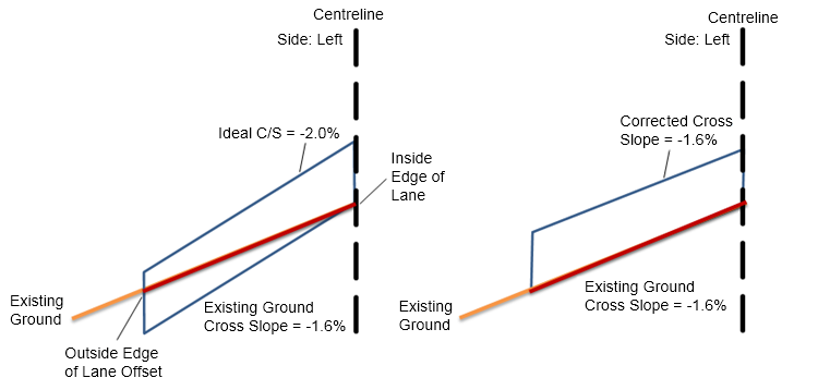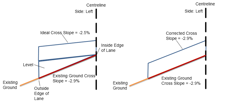 | Corrected Crossfall | Corrected Crossfall will be set between -1.5% and -2.5% crossfall |