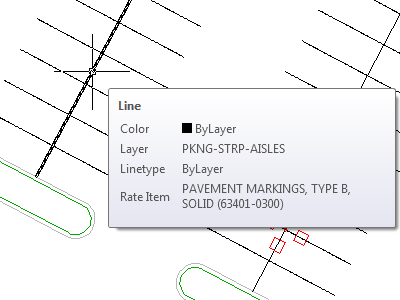 This action activates object selection mode, in which you select the outline of a closed object, as opposed to a point inside the object. Because some of the parking lot islands are subdivided by pipes, you can use object selection mode to assign the rate item codes to the entire object, not only to the closed area that you select.