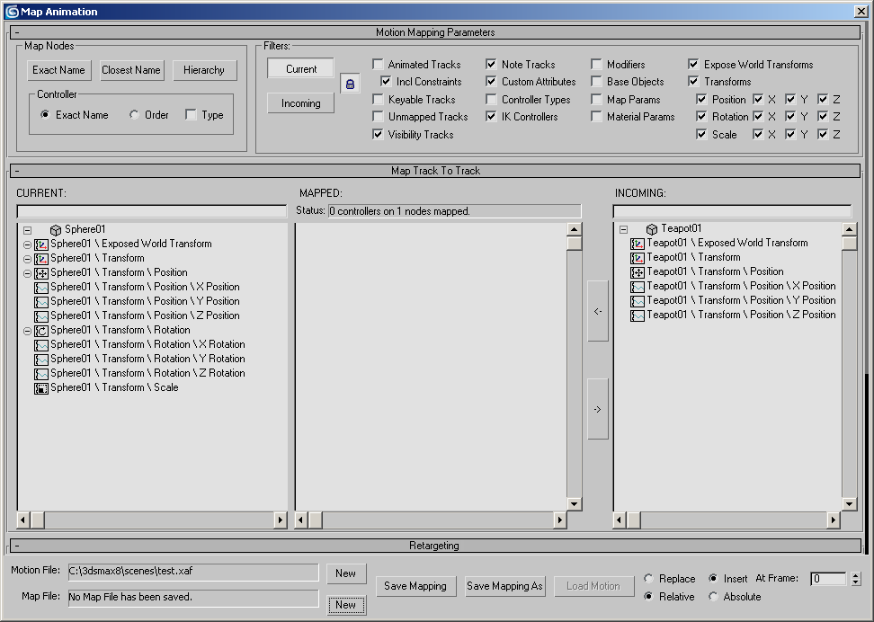 The Map Animation dialog lets you assign incoming animation tracks when using the Load Animation command. The dialog is resizable and contains three rollouts: for setting up basic parameters, doing the actual mapping, and doing retargeting.