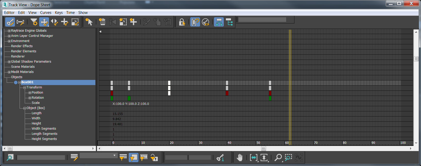 Track View uses two different modes: Curve Editor and Dope Sheet. Curve Editor mode displays animation as function curves, while Dope Sheet animation appears as a spreadsheet of keys and ranges. Keys are color-coded for easy identification. Some Track View functions, such as moving and deleting keys, are also available on the track bar near the time slider, which can be expanded to show curves as well. The Curve Editor and Dope Sheet open by default as floating windows, but you can also dock them under the viewports at the bottom of the interface, or even open them in a viewport. You can name Track View layouts and store them in a buffer for later reuse. Track View layouts are stored with the MAX scene file.