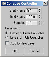 You can also use this tool to convert any controller track to a simple keyframed track. You can convert Rotation tracks to either Euler or TCB, and collapse Position and Scale tracks to either Bezier or Linear controllers.