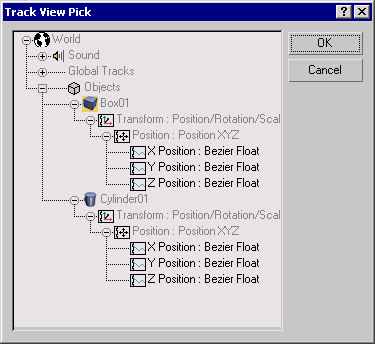 3ds Max opens this dialog when track selection is necessary; for example, when you click Add in the Master Block Parameters dialog. Select tracks in the dialog that you want to include in a Block. Valid tracks are darker.